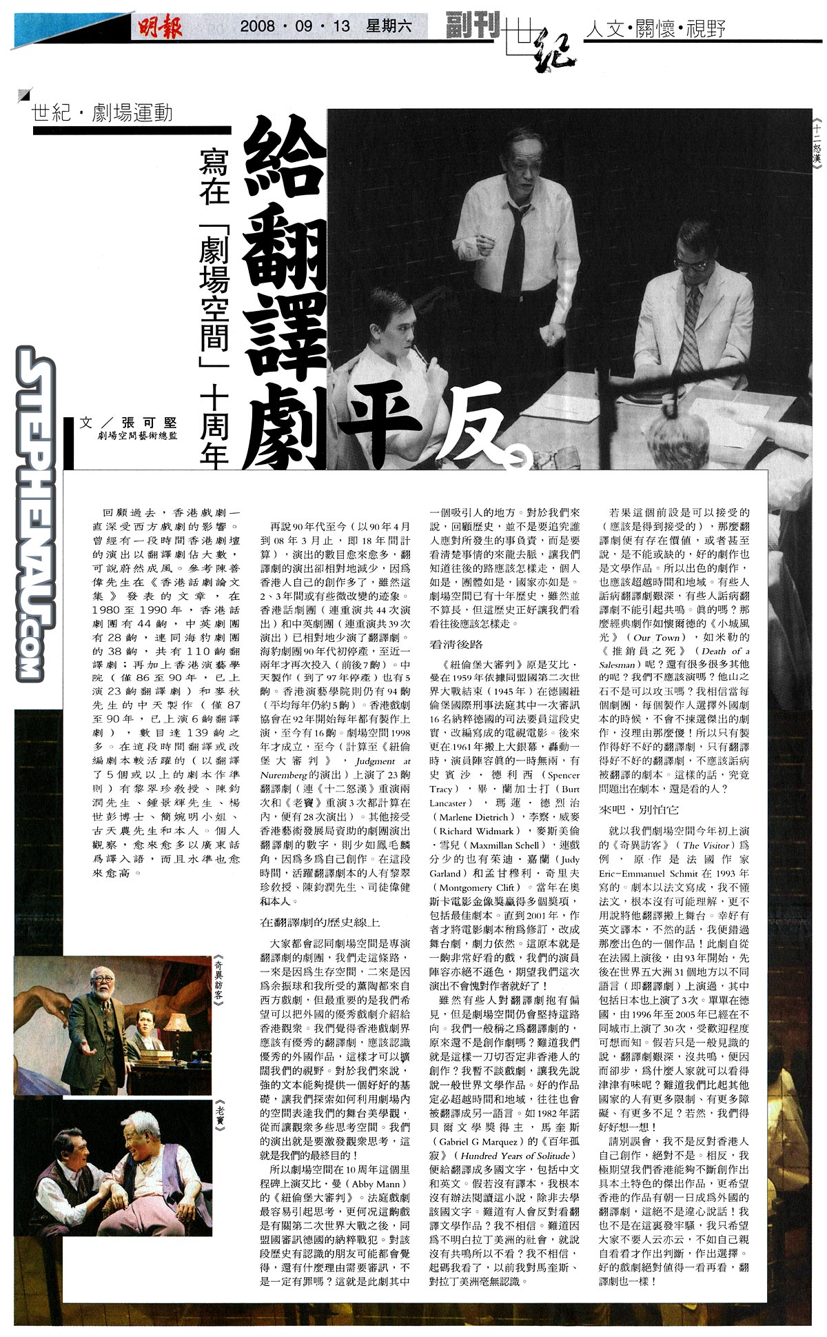若果這個前設是可以接受的(應該是得到接受的),那麽翻譯劇便有存在價值,或者甚至說,是不能或缺的,好的劇作也是文學作品。所以出色的劇作,也應該超越時間和地域。有些人詬病翻譯劇艱深,有些人詬病翻譯劇不能引起共鳴。真的嗎? 那麽經典劇作如懷爾德的《小城風光》(Our Town),如米勒的《推銷員之死》(Death of a Salesman)呢? 還有很多很多其他的呢? 我們不應該演嗎? 我相信當每個劇團,每個製作人選擇外國劇本的時候,不會不揀選傑出的劇作,沒理由那麽傻! 所以只有製作得好不好的翻譯劇,只有翻譯得好不好的翻譯劇,不應該詬病被翻譯的劇本。這樣的話,究竟問題出在劇本,還是看的人?