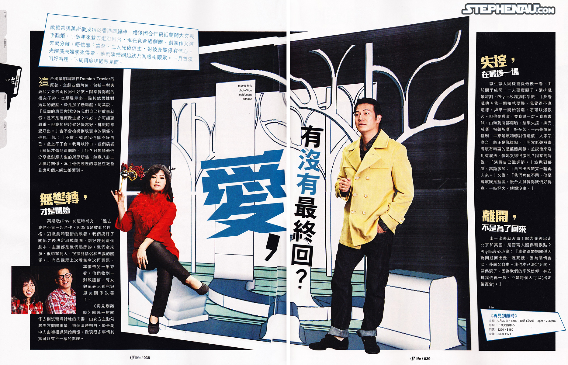 歐錦棠與萬斯敏成婚於香港回歸時,婚後因合作搞話劇團鬧大交幾乎離婚,十多年來雙方避忌同台,現在竟合組劇團,創團作又演夫妻分離,唔信邪? 當然,二人先後信主,對彼此關係有信心。夫婦演夫婦素來得意,他們演婚姻起跌尤其吸引觀眾。一月首演叫好叫座,下周再度與觀眾見面。text/ 麥慰宗 photo/ Pow edit/ Lucas art/ One